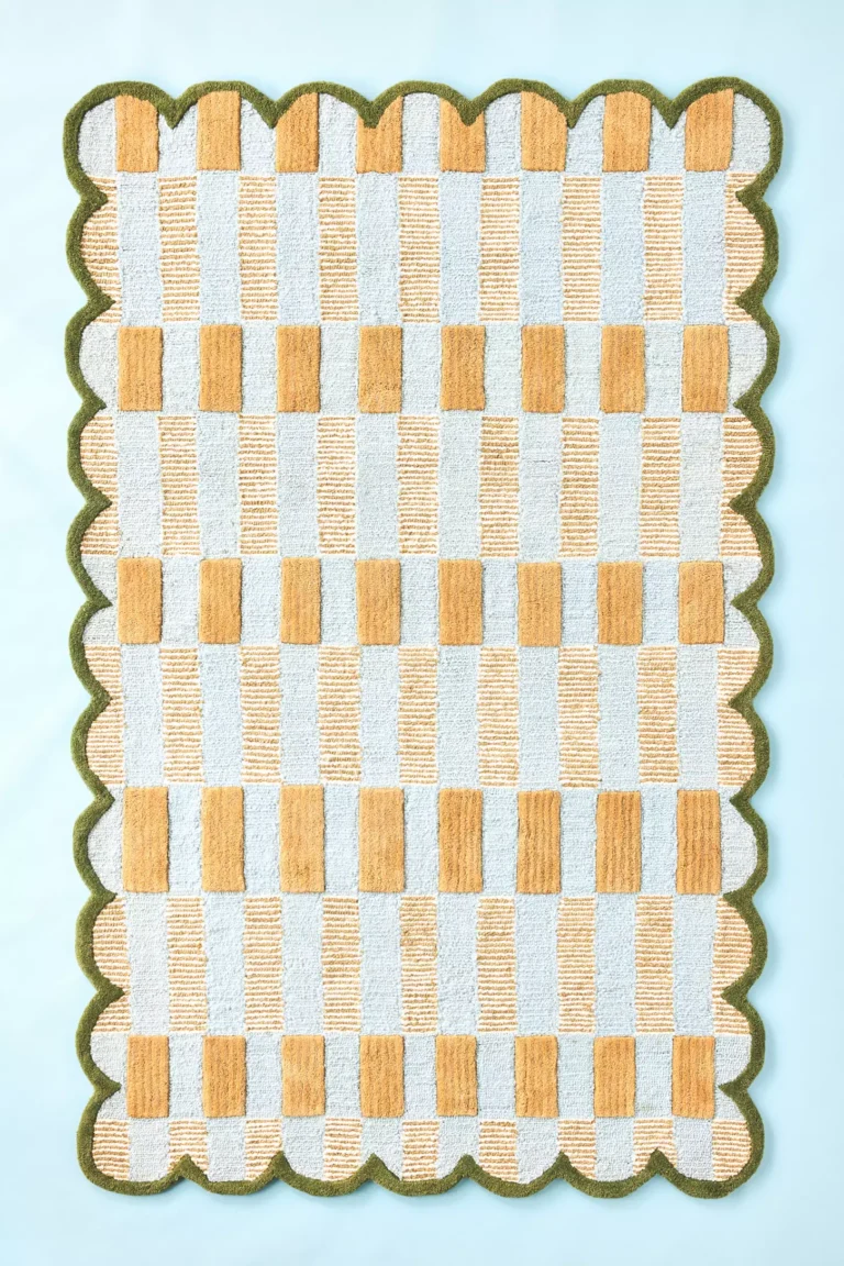 Handmade Yellow Checkerboard Rug with Scalloped Edge – Modern Geometric Tufted Carpet for Living Room or Kids Room Decor