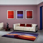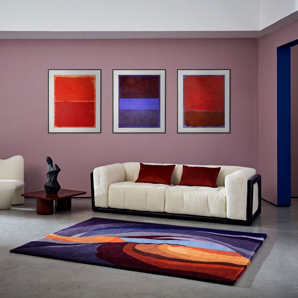 The Twilight colour way of the Antelope Canyon rug is inspired by the way the setting sun glints off the walls, throwing long shadows and creating dramatic highlights. The unique red colouring of the Arizona rocks is deepened by the rich glow of sunset, and the deep purples and oranges capture this brief but beautiful time of day.