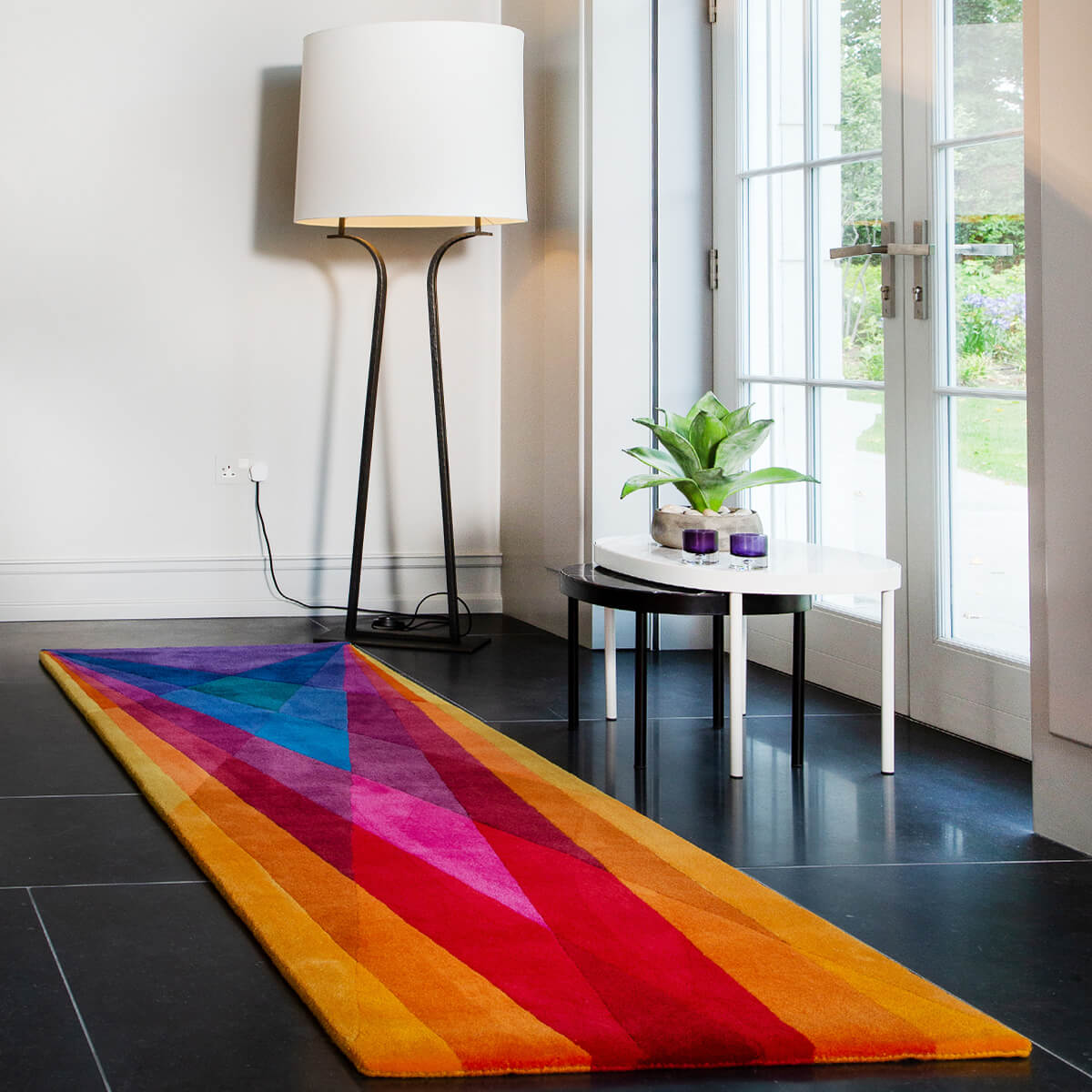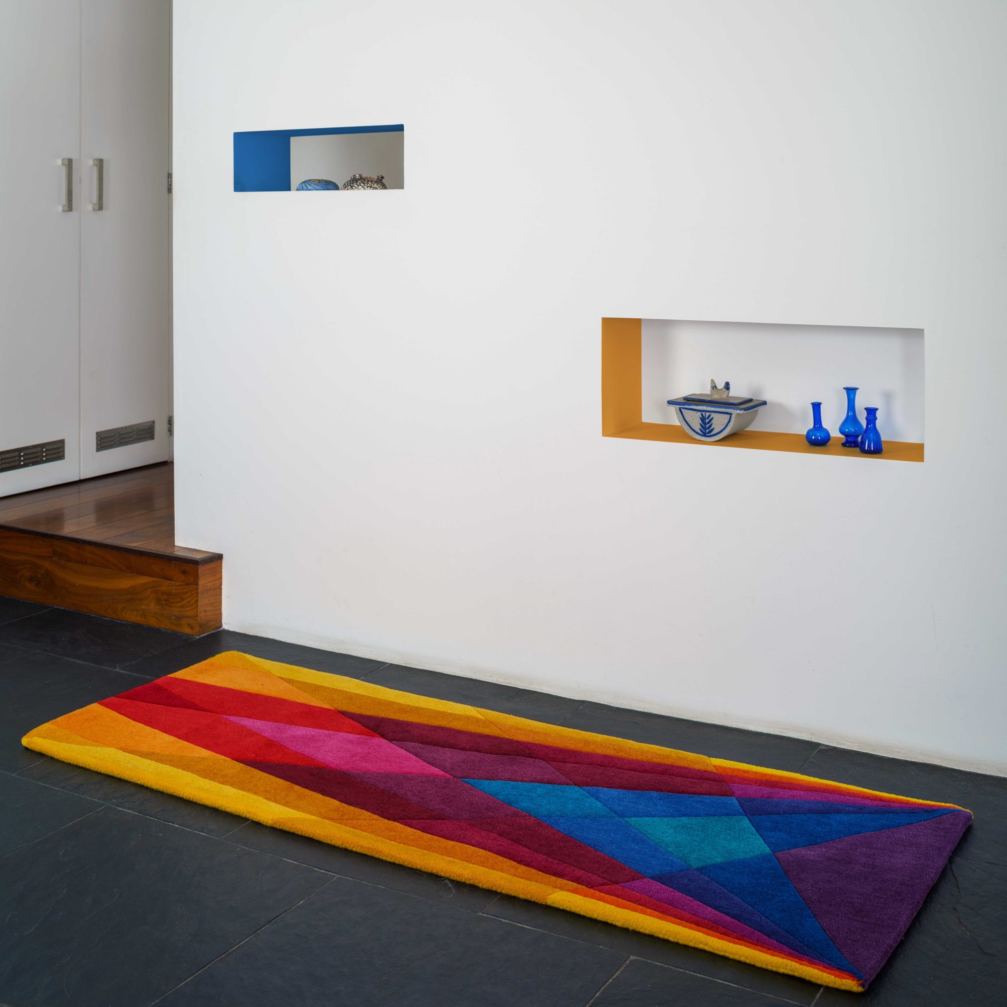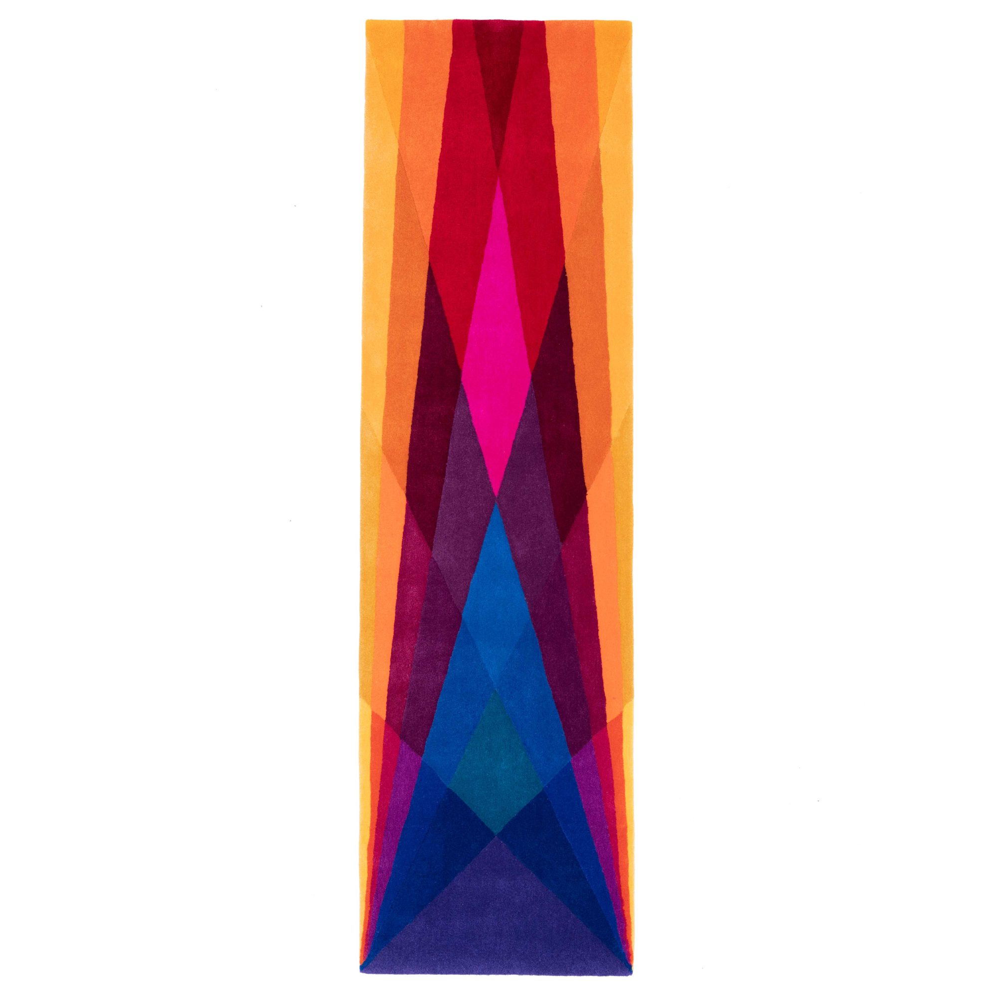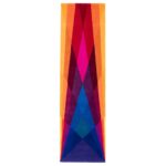 Rainbow runner rug uses multi coloured, hand dyed pure New Zealand wool to create a warm sense of transparency and luminosity. This is all achieved in a handmade, eco-friendly and high quality designer rug, which is rarely seen in other hallway rugs, kitchen rugs, dining room rugs, living room rugs or bedroom rugs.