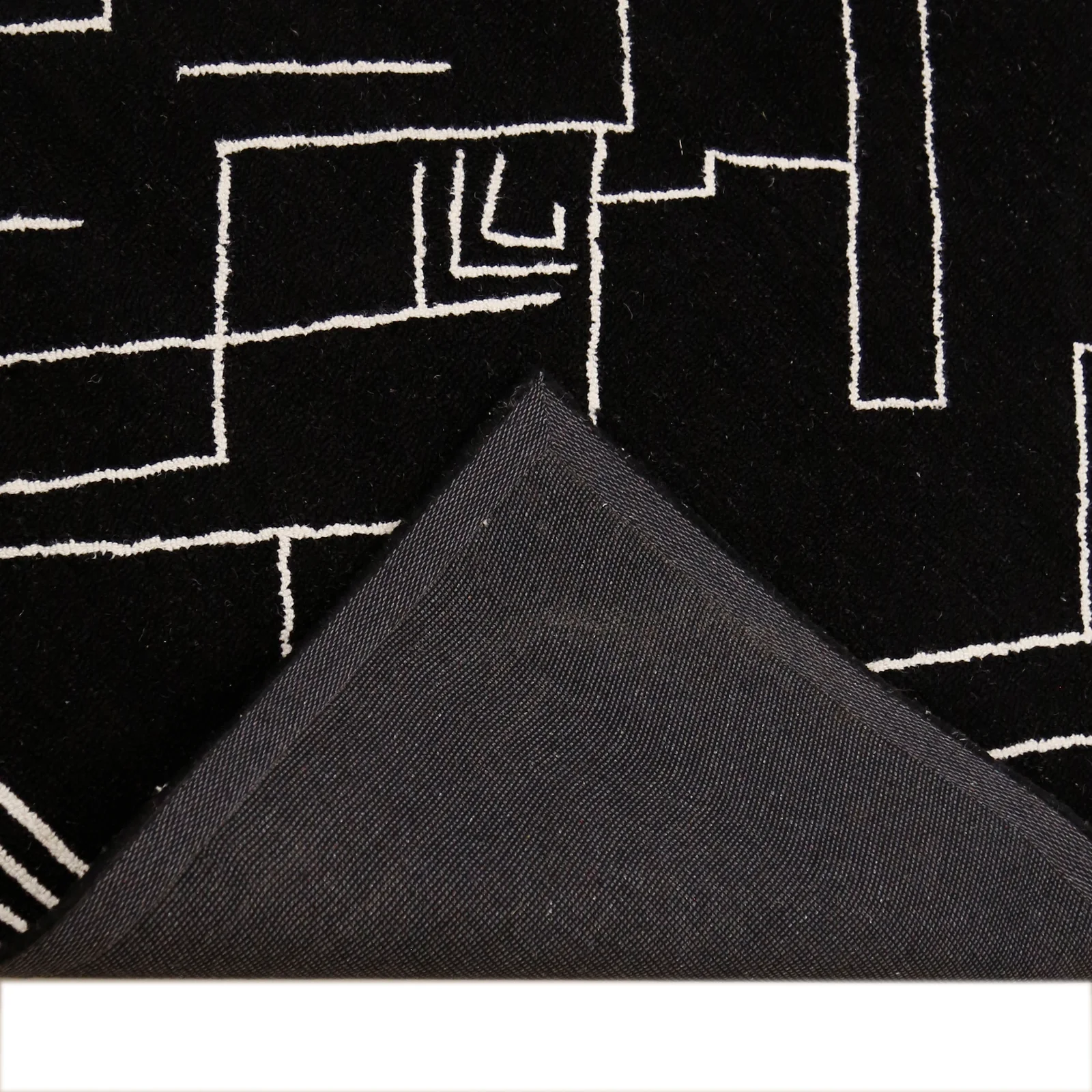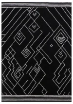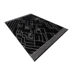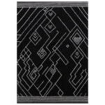 Rectangular rug with a geometric pattern in black and white. The design features a complex arrangement of white lines forming abstract shapes, including diamonds, squares, and zigzags, against a black background. There are also horizontal white stripes along the top and bottom edges of the rug.