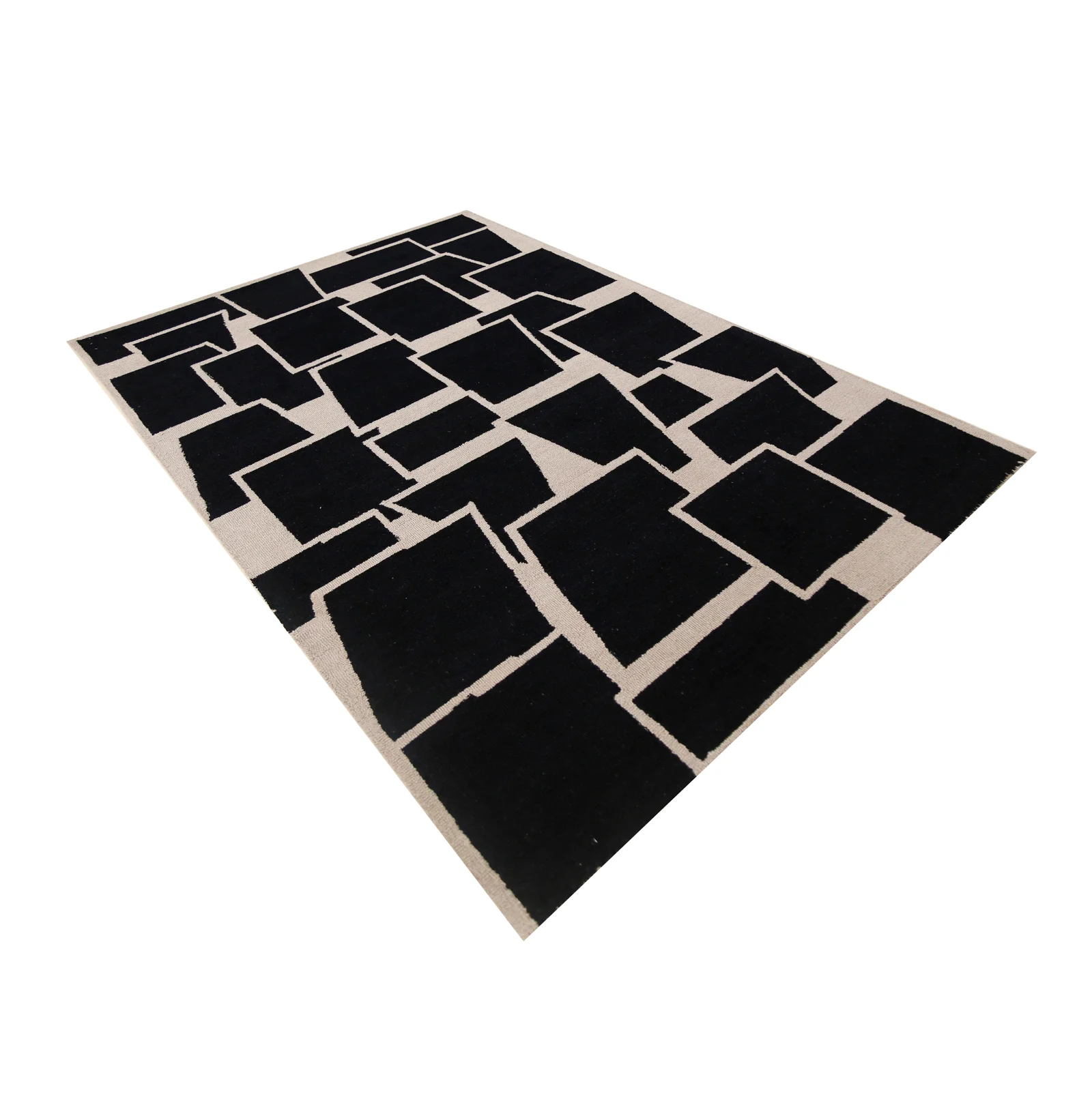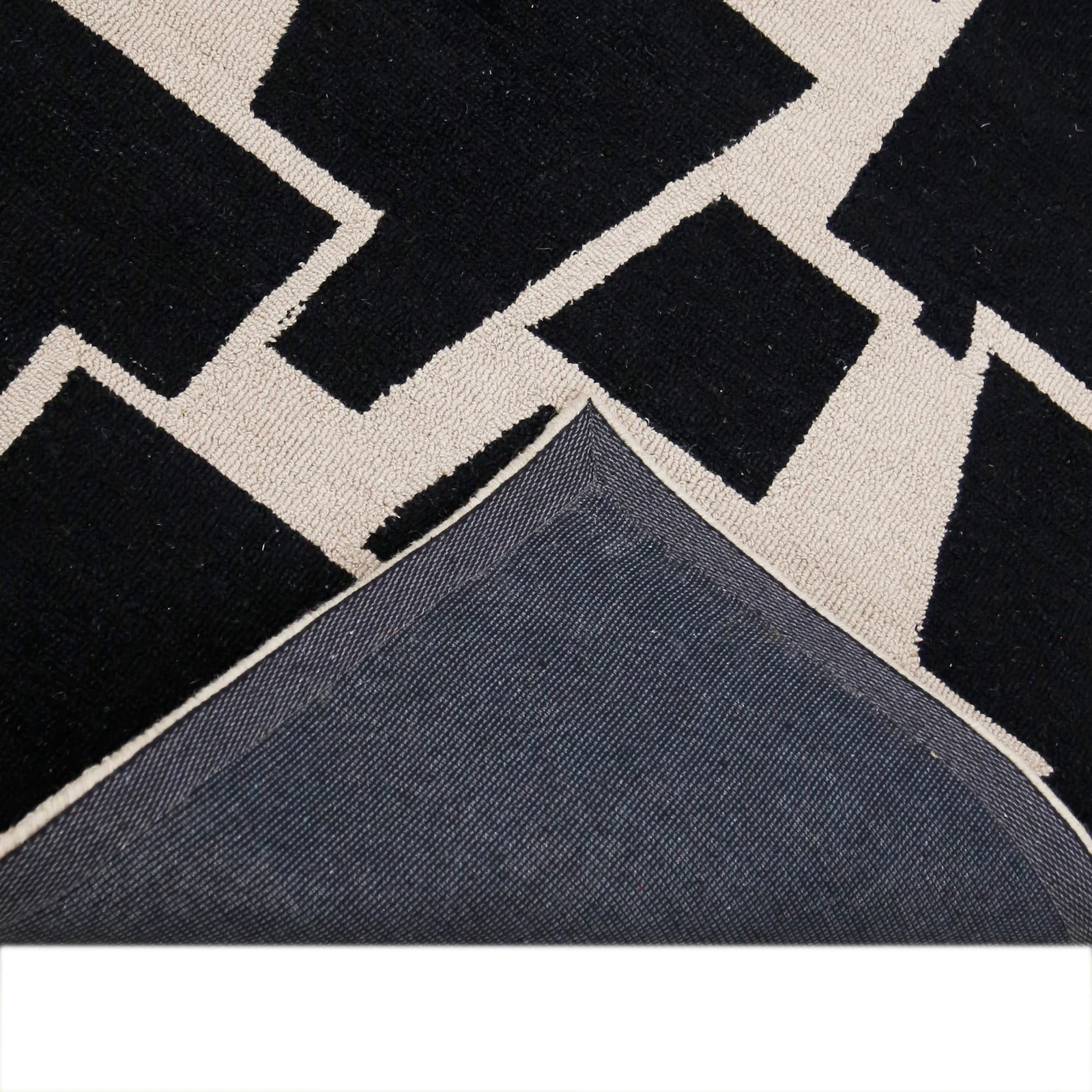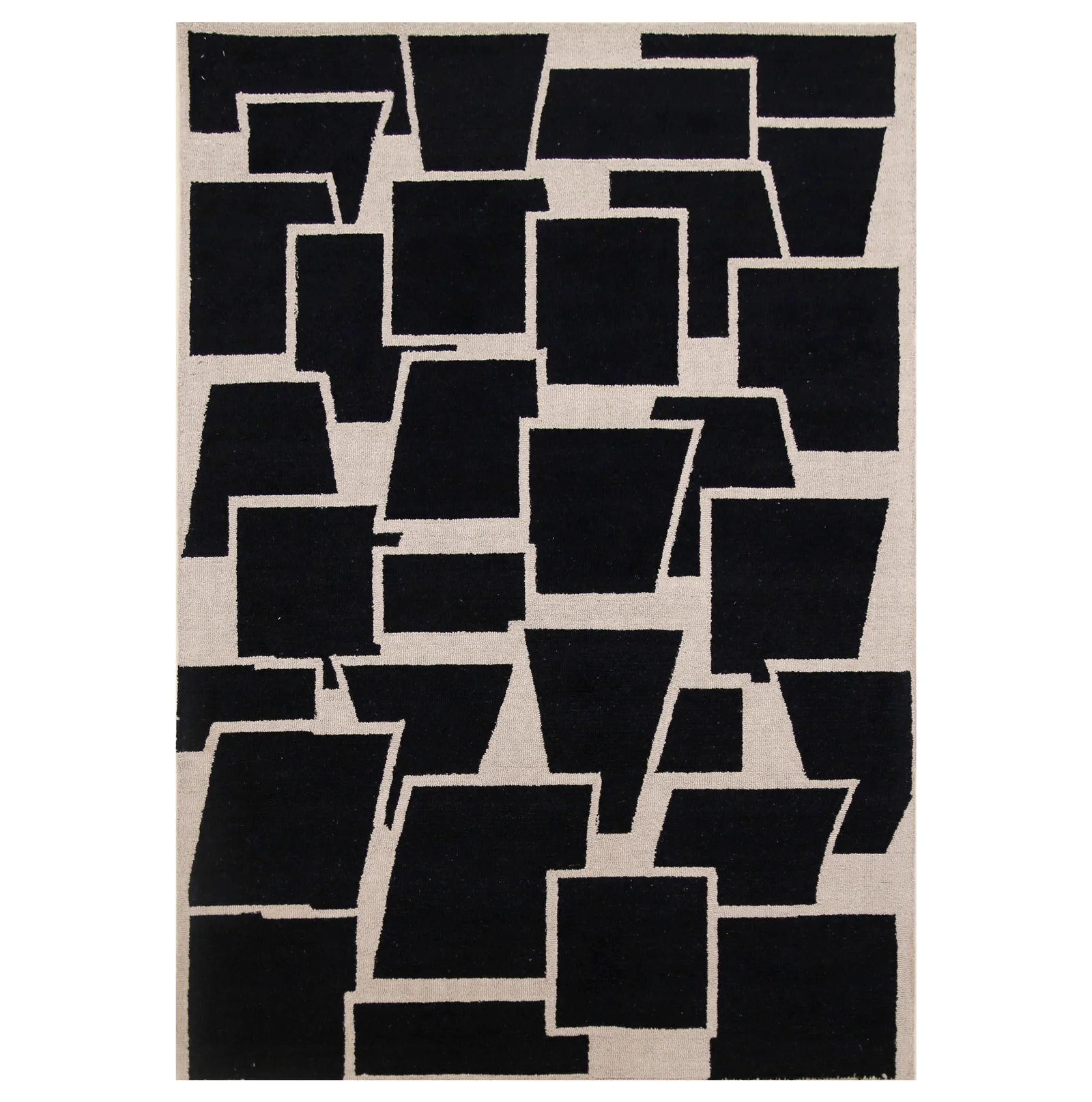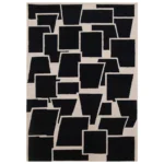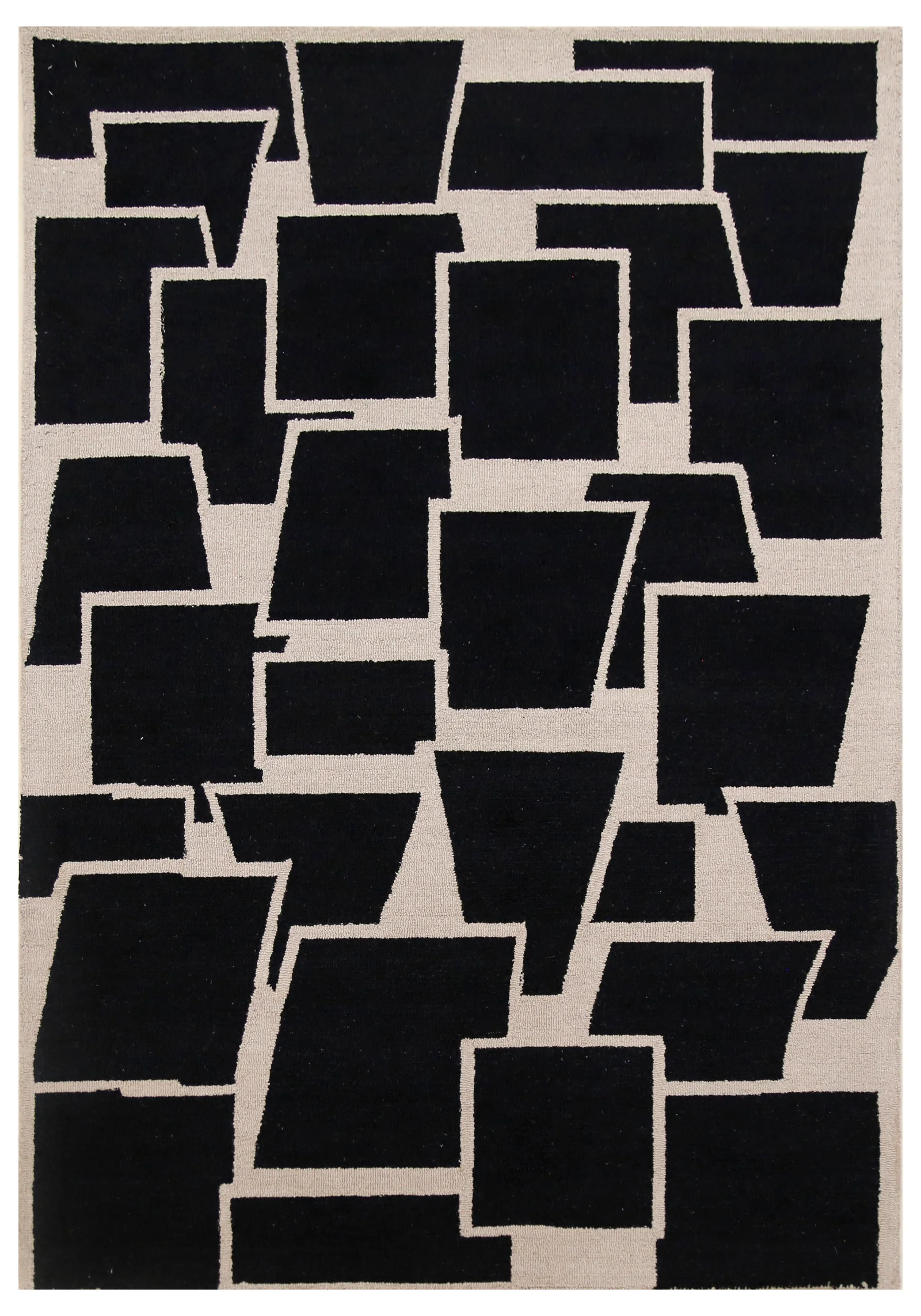 Rectangular, modern/abstract geometric. Black and off-white/cream. The pattern contains various shapes. Black shapes with white outlines creating a sense of depth and overlapping or adjacent shapes.